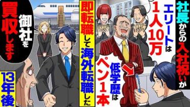 アニメ・漫画【マジかよ】社長からの入社祝いが「エリートは1人10万!低学歴のお前だけペン1本w」→速攻で退職して海外に転職した13年後…