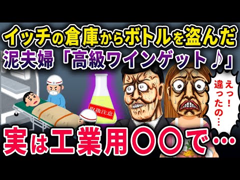 【マジかよ】イッチの倉庫から盗んだ泥夫婦『海外土産の高級ワインゲット♪』→料理に使って『ん?』実は工業用〇〇で一家全滅級の大惨事www