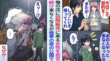アニメ・漫画【衝撃】俺定食屋に毎日営業に来る訪問販売員の美女。断り続け来なくなったが、極寒の夜の公園でホームレスになったボロボロの彼女を見つけ事情を聞くと…